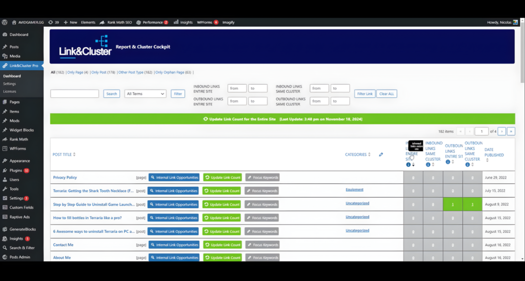 Link&Cluster is designed as an internal linking assistant that helps you organize your site into clear, structured topical clusters. It gives you a complete overview of your content, showing how pages are connected and how many internal links each post has, making it easy to spot gaps and improve weaker areas.